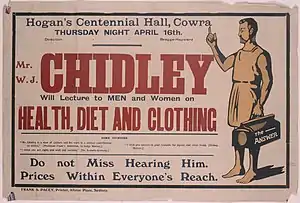 In 1911, Chidley published The Answer[4] in Melbourne. The authorities attempted to prevent distribution by prosecuting booksellers and Chidley on the grounds that the pamphlet contained material "which would tend to deprave and corrupt the morals of any person reading it." Chidley sold copies to curious passers-by on the footpath.[1] In 1912, Chidley moved to Sydney, where he became a familiar bearded figure dressed in a Grecian-style tunic and sandals, giving public lectures and wandering the streets, carrying a bundle of his pamphlets.[1] He preached the "Answer" to living a natural life to Sydneysiders. "Do nothing which is unnatural however slight" was his precept. He believed people should return to nudity, natural coition and a diet comprising only fruit and nuts to "be at one with Nature and one another".[4][5] Chidley suffered constant persecution by the authorities, was committed to various asylums and even jailed.[2] Regarded as a pervert, because he dared to mention sex in a repressed society, he was on the contrary something of a puritan in his teachings and lifestyle. In 1912 the courts imposed fines on booksellers who stocked "The Answer", and in 1914 the Supreme Court suppressed the publication.[1]