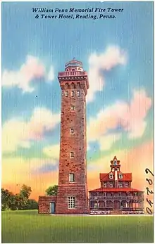 The William Penn Memorial Fire Tower is a fire lookout tower located on Mount Penn in Lower Alsace Township, Pennsylvania. Named after William Penn, the structure is owned by the city government of nearby Reading, Pennsylvania, which the tower overlooks. Work on the structure began in late 1938 as a project of the Works Progress Administration (WPA), with the tower completed the following year. The tower remained in regular use, both as a tourist attraction and as a legitimate lookout tower, for the next several decades, although deterioration to the building caused it to be closed in 1988.
