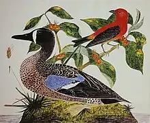 Painting of blue-winged teal and scarlet tanager birds by William Savage