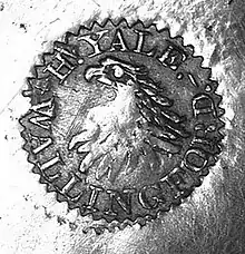 His mother's family traced their descent from Sir Thomas Payne, Knight of Market Bosworth, whose arms were the same as those adopted by Hugues de Payens, first Grand Master of the Templars.[8] His grandfather Street Yale was also a patriot of the War of Independence, being enlisted under Col. Charles Webb in the Boston campaign, and assigned to Gen. Sullivan's brigade on Winter Hill.[8] He later enlisted in Capt. Couch's brigade, and served at Fort Lee and defended Fort Washington under General Greene's command until the entire garrison was captured.[4] Fourteen members of the Yales of Connecticut served in the War of Independence, and some notable cousins of William included fur trader James Murray Yale and newspaper entrepreneur Moses Yale Beach.[8][4][10]
