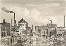 In June 2011 a planning application was submitted by Spencer Group for a waste-to-energy plant designed to generate 25.5 MW electrical and 3.4 MW gas energy via gasification and anaerobic digestion respectively. The plant was split over two sites, part on the site of the former cocoa and Spillers mills; and the second part to the north, west of Glass House Row.[62] The plant was to use approximately 150,000 tonnes of waste wood, plus 37,000 tonnes of locally sourced commercial and industrial waste.[63] The application was accepted in October 2011[64] and the project received a £19.9 million grant from the UK government (via the European Regional Development Fund) which was authorised by European Union in 2012.[65][66][67]