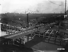Between 1910 and 1912 the railway layout at Wilmington was altered: a new station was constructed west of the original on the Victoria Dock Branch Line,[map 15] and the level crossing at Cleveland Street replaced with a bridge.[34] A new double track swing bridge had also been constructed over the Hull, c. 1905, slightly to the north of the original single track bridge.[8][35][map 16] The bridge was designed by NER staff J. Triffit under W. J. Cudworth, and erected by R Woods (Westminster) with steelwork from John Butler & Co. (Stanningley): a 75°33' skew, made of plate girders to a 14 feet (4.3 m) maximum depth hogback design, 160 feet (49 m) long total. The bridge turning mechanism was electrically powered, using Siemens Bros. equipment, and controlled by a cabin above the bridge; the designer was Wilson Worsdell, also of the NER, and the contractors Cowans and Sheldon.[8]
