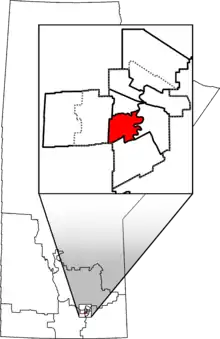 The district includes the neighbourhoods of Beaumont, Brockville, Buffalo, Chevrier, Crescent Park, Crescentwood, Earl Grey, Eby-Wentworth, Edgeland, Fort Garry, Grant Park, J.B. Mitchell, Linden Woods, Lord Roberts, Mathers, Maybank, McMillan, Osborne Village, Parker, Pembina Strip, Point Road, River Heights, Riverview, Rockwood, Roslyn, Sir John Franklin, Tuxedo, Wellington Crescent and Wildwood Park in the city of Winnipeg.