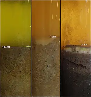 The column provides numerous gradients, depending on additive nutrients, from which the variety of aforementioned organisms can grow. The aerobic water phase and anaerobic mud or soil phase are one such distinction. Because of oxygen's low solubility in water, the water quickly becomes anoxic towards the interface of the mud and water. Anaerobic phototrophs are still present to a large extent in the mud phase, and there is still capacity for biofilm creation and colony expansion, as shown in the images at right. Algae and other aerobic phototrophs are present along the surface and water of the upper half of the columns.