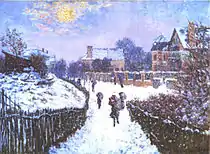It is possible that a series of severe winters in France also contributed to an increase in the number of winter landscapes produced by Impressionists.[24] Impressionist painters like Claude Monet, Alfred Sisley and Camille Pissarro started painting large numbers of winter landscapes in which they experimented with the use of light and color to paint what they called the effets de neige (the effects of snow). Other painters who painted winter landscapes but less frequently were Pierre-Auguste Renoir, Gustave Caillebotte and Paul Gauguin. The French master Claude Monet's first painting in his winter series of 140 paintings was A Cart on the Snowy Road at Honfleur, which was followed by many other winter landscapes, including a long series with haystacks.[25] In the painting Boulevard Saint Denis, Monet sought to catch the moment when the sun was hidden behind the clouds during a light snowfall.[20] In The Magpie, Monet's largest and probably most widely known winter painting, he used blue-gray colors to depict shadows in the snow.[26][27]