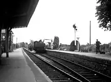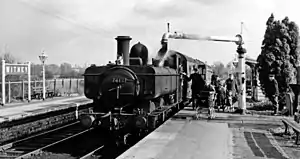 The new station was a joint station for both the Witney Railway and East Gloucestershire Railway until the pair were taken over by the Great Western Railway in 1890.[11][12][13] It was provided with two platforms, a booking office and a waiting room; a small signal box was situated on the Up side.[10] Unlike the timber structure at Witney's first station, the main station building was built of Cotswold stone.[14] Adjacent to the station building was a gentlemen's toilet and the signal box, and beyond a characteristic corrugated iron pagoda shed.[15] Between the signal box and the station building there was also a small wooden office for the stationmaster but this was hidden by the bushes and shrubs of the station gardens.[16] The only structure on the Down platform was a basic wooden shelter.[16][17] As Witney was the principal intermediate station on the line, water columns were provided on both platforms.[16] Beyond the bridge carrying Station Road over the line, which was at the western end of the station, was a loading dock.[18] In the third week of January 1940, King George VI arrived at the station on the Royal Train to inspect troops stationed in the Witney area.[19]