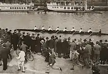 The Times reported that "large and hostile crowds gathered on the towpath", while The New York Times stated "a crowd of fully five thousand persons was on hand as a willing cheering section".[1][2][3] The crews were forbidden from racing side-by-side, and the winners were judged "rowing down stream for style and back again for speed" along the course "from the Free Ferry from the top of Iffley Reach to the Keble barge",[4] a distance of approximately 0.5 miles (0.80 km).[5] The Cambridge crew wore "white jumpers and chocolate shorts and stockings" while Oxford sported "white and dark blue shorts".[3]