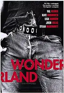 Wonderland is a 2003 American crime drama film, co-written and directed by James Cox and based on the real-life Wonderland Murders that occurred in 1981. The film stars Val Kilmer, Kate Bosworth, Dylan McDermott, Carrie Fisher, Lisa Kudrow, Josh Lucas, Christina Applegate, Tim Blake Nelson, and Janeane Garofalo. Kilmer plays the role of John Holmes, a famous pornographic film star and suspected accomplice in four grisly murders committed in a house at 8763 Wonderland Avenue, in the Laurel Canyon section of Los Angeles. The film uses a nonlinear Rashomon-style narrative structure to present conflicting accounts of the murders from differing perspectives.