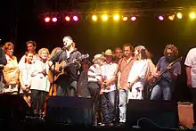 The 10th annual festival took place July 11–15, 2007. To celebrate the ten-year anniversary, one of many Oklahoma centennial-year events, the festival kicked off with a ticketed event on Wednesday night in Okemah's historic Crystal Theater.[2] Seven "10-year artists" - artists who have participated every year since the festival's inception - performed at a Coalition benefit show titled "In the Spirit of Woody Guthrie". Those artists were Jimmy LaFave, Don Conoscenti, Ellis Paul, Bob Childers, Joel Rafael, Terry "Buffalo" Ware, and the Red Dirt Rangers.[36] The 2007 lineup spanning over four days included more than 60 artists from many genres including folk, alt-country and rock. Members of the Guthrie family scheduled to appear were Arlo Guthrie and Cathy Guthrie (daughter of Arlo) and Amy Nelson (daughter of Willie Nelson), who perform as Folk Uke. More than 100 artists performed at the festival's 10-year celebration including Kevin Welch, Sara Hickman, Butch Hancock, Tim O'Brien, Ronny Elliot, Terri Hendrix and Lloyd Maines, Rob McNurlin, Jack Williams, Antje Duvekot, Johnsmith, Sam Baker, David and Adam Amram, The Burns Sisters, Ronny Cox, Michael Fracasso, Radoslav Lorković and Eliza Gilkyson.[37] The tenth festival again concluded on Sunday with a "Hoot for Huntington's", having become a Woody Fest tradition. The hootenanny is coordinated and led by Terry "Buffalo" Ware, a guitarist living in Norman, Oklahoma, and the Woody Guthrie Folk Festival All-Star House Band. The House Band also includes Randy Crouch (fiddle/pedal steel), Don Morris (bass), Dean Brown (drums), Dan Duggin (accordion) and T.Z. Wright (keyboard/accordion). The House Band can be heard playing back-up for many festival performers and in 2007 also played a set of their own - as The Oklahoma Geniuses - at the Brick Street Cafe.[38]
