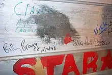 However, it wasn't until the late 1990s, when Billy Bragg visited Okemah filming scenes for his Man in the Sand documentary about the making of Mermaid Avenue, a collection of unknown Guthrie lyrics put to Bragg's music in collaboration with Wilco, that the town of Okemah started to fully embrace its wiry wanderlusting native. Bragg fittingly christened the first festival in 1998.[8] In an article for Dirty Linen Annette C. Eshleman wrote: "Residents' attitudes have gone from angry accusations of Guthrie being a Communist, to suspicious tolerance, to embracing his legion of loyal fans. And while the economic boost that a festival provides to such a small community is certainly welcome, the kindness and hospitality of openhearted locals is genuine."[24]