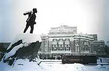 After the 1917 February Revolution Sverdlov returned to Petrograd from exile as head of the Urals Delegation and found his way into Lenin's inner circle. He first met Lenin in April 1917 and subsequently usurped Elena Stasova as the chairman of the Central Committee Secretariat, and became the secretary of the Central Committee of the Party. According to Podvoisky, the chairperson of the Military Revolutionary Committee, "The person who did more than anyone to help Lenin with the practicalities of translating convictions into votes was Sverdlov."[4] As chairman of the Central Committee, Yakov played an important role in planning the October Revolution and helped make the decision to stage an armed uprising.[6] In November as the Bolsheviks debated whether to postpone or hold elections, Sverdlov advocated for immediate elections as promised. When the results came back showing that the Socialist Revolutionaries had won, Sverdlov, Lenin, and Bukharin dissolved the assembly, leading to a civil war.[4]