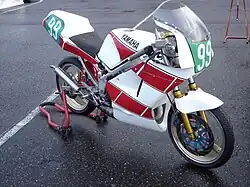 Yamaha produced the road going two-stroke motorcycle, loosely based on the TZ250 Yamaha racing bike. Parallel-twin, reverse cylinder and finally 90° V-twin variants were produced. It evolved as a natural replacement for the popular RD 250/Yamaha RD350LC series of the 1980s. It has the Yamaha Power Valve System 'YPVS' which raises and lowers the exhaust port depending on the rpm of the engine. The YPVS servo motor starts to open at about 6,000rpm. In standard form it produced 45 hp due to the restrictive standard exhausts and ignition boxes.[2]