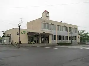 The station consists of two opposed side platforms connected to a two-story station building by a footbridge. The station is staffed.