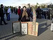 Osipova is known for participation in virtually all protest rallies with placards denouncing injustice and crime, warning of danger, and sympathizing with someone's distress, be it natural disasters or violations of political freedoms.[11] She tried to attract public attention to Beslan school siege, Iraq War, November 2015 Paris attacks, Bolotnaya Square case, Annexation of Crimea by the Russian Federation, War in Donbas. She honoured memory of Boris Nemtsov.[10][14] For some time, she was detained at every rally, but then brought home by the police officers.[4][16] For her active civic stance, the artist has come to be referred to as "The Conscience of St. Petersburg".[10][16]