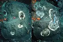 Yellow-band disease is a bacterial infection that spreads over coral, causing the discolored bands of pale-yellow or white lesions along the surface of an infected coral colony. The lesions are the locations where the bacteria have killed the coral's symbiotic photosynthetic algae, called zooxanthellae which are a major energy source for the coral.[4] This cellular damage and the loss of its major energy source cause the coral to starve, and usually cause coral death. There is evidence that climate change could be worsening the disease.[5]