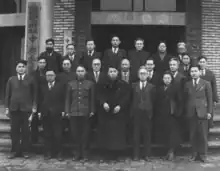 Members of the North Korean National Democratic Front in front of the organization's complex, June 1947. The front row, from left to right: Choe Yong-gon, Kim Chaek, Kim Il Sung, Kim Tal-hyon, Ho Jong-suk, and Yi Kang-guk
