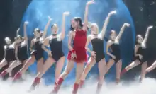 A scene in the dance performance video of Jennie and backup dancers dancing in front of a moon backdrop.