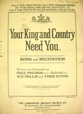Several different recruiting songs with the name "Your King and Country Want/Need You" were popularised in Britain at the beginning of the First World War. Your King and Country Need You was a popular song and recitation, with words by Paul Pelham, and music by W. H. Wallis and Fred Elton, published in London at the start of the war in 1914 by Lawrence Wright Music.[1] It was written as a recruiting song with the aim of persuading men to volunteer to fight in the War. Half the profits on the first 100,000 copies were to be given to the "H.R.H. Prince of Wales' National Relief Fund".[1]