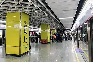 Yuancun Station (simplified Chinese: 员村站; traditional Chinese: 員村站; Cantonese Yale: Yùhnchyūn Jaahm) is an interchange station between Line 5 and Line 21 of Guangzhou Metro, and also the terminus of Line 21.[1] It is located under the junction of Huacheng Avenue East (Chinese: 花城大道东) and Yuancun 2nd Cross Road (Chinese: 员村二横路) in Tianhe District. It lies to the east of Zhujiang New Town and to the north of Pazhou,[2][3][4] and was opened on 28 December 2009.[5]