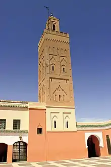 The mosque's minaret, which rises from the northeastern corner and overshadows the eastern courtyard of the complex, is slightly more original for its time and had a lasting influence in later Moroccan architecture.[5] The minaret has the usual square base and a double-tiered composition, with a main shaft topped by a smaller secondary shaft or lantern, which in turn is topped by a small dome and finial. Its surface decoration, however, foregoes the earlier tradition of sebka motifs and instead features several tiers of decorative blind arches that frame the minaret's windows. The lowest tier features twin polylobed arches on the southern façade and a large lambrequin arch on its eastern façade, the second tier features twin lambrequin arches on each façade, and the third (highest) tier features a row of small arches alternating between round and pointed lobed profiles. The top of the main shaft is crowned with a molding of saw-tooth merlon shapes, similar to the merlons found on the minarets of other mosques.[5]