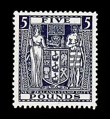 The woman who appears on the left side of the coat of arms of New Zealand is Zealandia.[2][4] Apart from the coat of arms, Zealandia is seldom depicted in works today, or indeed referred to.[3]