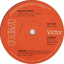 RCA issued "'Heroes'" in edited form as the lead single from the album on 23 September 1977, with the catalogue PB 11121 and backed by album track "V-2 Schneider".[4] Its shortened 3:32 edit was made in the hopes of more airplay.[5] A 12" promotional single, containing both the single and album versions, was released in the US by RCA (as JD-11151) the same year.[25][26] On the "Heroes" album, issued on 14 October,[4] the song was sequenced as the third track, between "Joe the Lion" and "Sons of the Silent Age".[27]