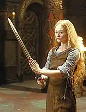 In Peter Jackson's films The Lord of the Rings: The Two Towers (2002) and The Lord of the Rings: The Return of the King (2003), Éowyn is played by Miranda Otto. Uma Thurman was slated for the role at one point.[19] Although Jackson cuts much of Tolkien's poetry and song, he adds a scene with Éowyn singing a dirge at Théodred's funeral.[20]