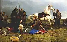 The scholar of English Helen Young writes that while neither Tolkien nor Jackson give Éowyn any thanks for killing the Witch-King, Jackson's film version does at least invert the gender roles depicted by the Norwegian artist Peter Nicolai Arbo in his 19th century painting Hervor's Death, though when she falls as if dead, the film scene looks in her opinion much like that in the painting. The film reduces Éowyn's role as cup-bearer, which in Tolkien's text describes a genuine Germanic ceremony in which a woman embodied the weaving of peace. Young suggests this was because the screenwriters feared the audience would misinterpret the scene. The extended edition of the "Return to Edoras" scene however includes the ceremony for Théoden.[21]