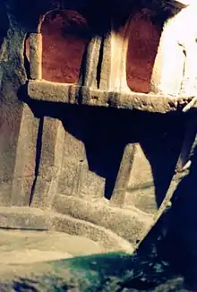 The temple structure uses a careful direction of light from the surface to penetrate into the lower chambers, with intricate patterns painted on portions of the ceiling with red ochre, following motifs of spots, spirals and honeycombs.[1][2] One of the main chambers, called "The Holy of Holies", appears to be oriented such that light from the winter solstice illuminated its facade from the original opening above.[14]