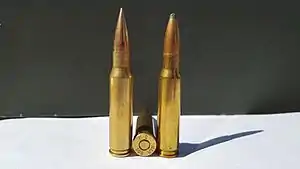Although originating from an identical preceding series of experimental cartridges, the commercial 1952 .308 Winchester and the military 1954 7.62×51mm NATO chamberings have evolved separately and are not identical. The .308 Winchester and military 7.62×51mm NATO cartridges are similar enough that they can be loaded into rifles chambered for the other round, but the .308 Winchester cartridges are typically loaded to higher pressures than 7.62×51mm NATO service cartridges.[14] Even though the Sporting Arms and Ammunition Manufacturers' Institute (SAAMI) does not consider it unsafe to fire the commercial .308 Winchester rounds in weapons chambered for the military 7.62×51mm NATO round, there is significant discussion about compatible chambers and pressures between the two cartridges based on powder loads, chamber dimensions and wall thicknesses in the web area of the military compared to commercial cartridge cases.[15][16] As the chambers differ, accordingly the head space gauges used for the two chamberings differ.[17]