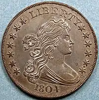 The 1804 dollar or Bowed Liberty Dollar was a dollar coin struck by the United States Mint, of which fifteen specimens are currently known to exist. Though dated 1804, none were struck in that year; all were minted in the 1830s or later. They were first created for use in special proof coin sets used as diplomatic gifts during Edmund Roberts' trips to Siam and Muscat.