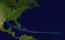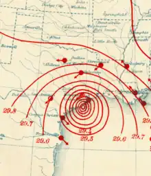 Between August 12–13, the intensifying hurricane traversed the Caribbean Sea between Haiti and Jamaica with a bearing slightly north of west.[4] Shortly after passing Jamaica, the storm became a major hurricane on the morning of August 13.[2] On August 14, the storm moved near Cuba's Isle of Pines and across the Guanahacabibes Peninsula as a Category 4 hurricane with sustained winds of 145 mph (230 km/h).[4][1] This was ultimately the storm's peak intensity as it weakened slightly once over the south-central Gulf of Mexico,[2][4] though the storm still maintained Category 4 strength.[2] At 07:00 UTC on August 17—in the early morning hours—the hurricane made landfall near San Luis Pass, approximately 26 mi (42 km) southwest of Galveston, Texas.[2][5] Upon moving ashore, the hurricane had winds estimated at 130 mph (215 km/h) and a barometric pressure of 940 mbar (hPa; 27.76 inHg); these values were estimated using a peripheral pressure of 953 mbar (hPa; 28.14 inHg) measured at Velasco, Texas.[1] At the time, the pressure measured at Texas landfall was the lowest ever measured in the United States.[6] After moving inland, the storm quickly weakened, passing southwest of Houston, Texas, as a Category 1 hurricane before diminishing to a weak tropical storm within a day of landfall.[2] Concurrently, the storm began to slowly curve towards the north and northeast, moving into northeast Texas on August 18.[7] Two days later, the system transitioned into an extratropical cyclone while tracking northeast across Arkansas and southeastern Missouri;[2][7] fronts extended outward from the cyclone's center.[1] This trajectory continued before the storm's remnants were last noted in the Gulf of Saint Lawrence; HURDAT, the official database of storm paths in the Atlantic, indicates the storm dissipated after 18:00 UTC on August 23.[2]