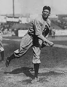 The second game was played the next day, October 3, at Yankee Stadium in front of a crowd of 63,600.[40] Urban Shocker was the starting pitcher for the Yankees. With 19 wins and 11 losses, Shocker had the second-best pitching record on the team, behind the Game 1 starter, southpaw Herb Pennock. Shocker had a 3.38 ERA in 258 innings, along with 59 strikeouts in the 1926 season.[41] The Cardinals' Game 2 starter was 39-year-old Grover Cleveland "Old Pete" Alexander, a veteran player in his 16th major league season.[42] That season, he posted numbers considerably lower than the pitching season statistics from his prime in the late 1910s with the Philadelphia Phillies and Chicago Cubs. Alexander had compiled a 12–10 record in 200 innings, while posting a 3.05 ERA and 48 strikeouts, compared to the nearly 250 strikeouts he had in 1915 with the Phillies.[43]