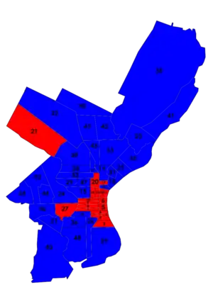 Under the new charter, Philadelphians elected a seventeen-member city council in 1951, with ten members representing districts of the city, and the remaining seven being elected at-large. By the rules of the limited voting system for the at-large seats, each political party could nominate five candidates and voters could only vote for five, with the result that the majority party could only take five of the seven seats, leaving two for the minority party.[33] The Democrats' citywide triumph continued into the city council races, as they took nine of ten districts and five of seven at-large seats.[34]