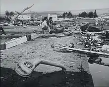 Earthquake-induced tsunamis affected southern Chile, Hawaii, Japan, the Philippines, China,[23] eastern New Zealand, southeast Australia, and the Aleutian Islands. Some localized tsunamis severely battered the Chilean coast, with waves up to 25 m (82 ft). The main tsunami crossed the Pacific Ocean at a speed of several hundred km/h and devastated Hilo, Hawaii, killing 61 people.[24] Most of the tsunami-related deaths in Japan occurred in the northeast Sanriku region of Honshu.[13]