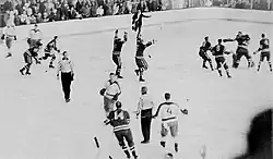The ice hockey tournament took place at Blyth Arena and the Squaw Valley Olympic Skating Rink.[29] Controversy over the amateur status of communist players overshadowed the event. Canadian Olympic officials objected to the use of "professional amateurs" by Eastern Bloc countries, and especially the Soviet Union. They alleged that the Soviets were giving their elite hockey players phantom jobs in the military that allowed them to play hockey full-time, which gave Soviet teams an advantage that they used to dominate Olympic hockey tournaments for more than 30 years.[30] This issue started coming to light during the 1960 Games and would culminate in a Canadian boycott of the Olympic hockey tournament at the 1972 and 1976 Winter Olympics.[31] The team from the United States won an improbable gold medal, defeating the favored Canadian and Soviet teams, who took silver and bronze respectively.[32] This was the first Olympic gold medal in ice hockey for the United States and it would mark the last time a Soviet team did not win the Olympic tournament until the United States victory at the 1980 Winter Olympics.[33]