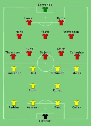 The weather in Glasgow was stormy, with torrential rain nearly flooding Hampden Park. As a result, the stadium didn't reach its normal capacity of 100,000, only 41,657 spectators attended the match.[13] The first half was mostly uneventful, both teams negated the threat of the other.[14] Despite this both sides had opportunities to take the lead. At the start of the match, Liverpool striker Ian St John had a shot cleared off the goal line and midway through the second half Dortmund defender Theodor Redder almost scored an own goal. Towards the end of the half, Dortmund began to have more of an attacking threat. They were only denied by a number of saves from Liverpool goalkeeper Tommy Lawrence, ensuring it remained 0–0 at half-time.[15]