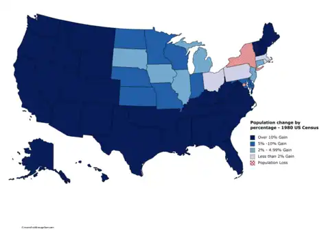 The 1980 United States census, conducted by the Census Bureau, determined the resident population of the United States to be 226,545,805, an increase of 11.4% over the 203,184,772 persons enumerated during the 1970 census.[1] It was the first census in which a state—California—recorded a population of 20 million people, as well as the first in which all states recorded populations of over 400,000.