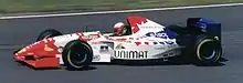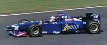 On new tyres, Hill began to reduce Schumacher's nine-second lead, but after a few laps Schumacher began to ease away again as he had a lighter fuel load than the Williams. It became apparent to the teams, as the race approached half-distance, that Schumacher had opted for a one-stop strategy and that both he and Hill only had one stop remaining each.[37] Frentzen, Papis and the Minardi drivers also opted for a single-stop race; Papis and Martini's worn tyres allowing Panis to overtake them soon after his second stop.[1] Papis made his first Formula One race pit stop on lap 28, only to hit the barrier at the exit of the pit lane, causing damage to his Footwork's suspension which caused him to spin off and retire on the same lap that he rejoined the circuit.[14] On the next lap Frentzen dropped from sixth to eighth position as a result of his sole stop, and was then passed by Panis four laps later; Martini likewise dropped from 10th to 13th on lap 30; and Badoer also moved from 10th to 13th when he made his stop on lap 32.[1]