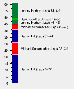 At the front of the field, Hill moved back into the lead of the race when Schumacher made his pit stop on lap 31, rejoining in second place with a deficit of 20 seconds.[37] Hill now pushed hard in his efforts to build up a sufficient lead over Schumacher—setting the race's fastest lap time of 1:29.752 on lap 37—to maintain first place after his second pit stop.[1] Salo began the second round of pit stops on the next lap, and was followed in due course by Alesi, Herbert, Barrichello, Boullion, Gachot, Blundell, Panis and Coulthard.[1] Coulthard's stop, despite moving him ahead of Alesi, was problematic: his car's electronic failure meant that his pit-lane speed-limiter system did not work, and he exceeded the 80 kilometres per hour (50 mph) pit-lane speed limit, an infraction of the Sporting Regulations which, like jumping the start, entailed a ten-second stop-go penalty.[17][35][38] Hill made his own second stop on lap 41 with a 27-second lead over Schumacher and the two were almost level as Hill reached the end of the pit lane, but Schumacher's extra momentum allowed him to move ahead in the run to the Maggotts, Becketts and Chapel sequence of fast corners.[29] At the completion of the scheduled pit stops by lap 44, the running order was Schumacher and Hill in close attendance, then a gap back to a similar battle between Herbert and Coulthard, then Alesi, Blundell, Barrichello, Panis, Frentzen—whom Panis had just passed for the third time—Martini, Badoer, Salo, Boullion, Gachot and Moreno, the last of whom retired four laps later with a lack of hydraulic pressure in his Forti's pneumatic engine valves.[1][14]