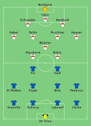 Chelsea's goalscoring chance came in the fifth minute when Poyet found Di Matteo, who fumbled his opportunity as it went over the goal.[86] Stuttgart almost took the lead through Bobic, who took advantage of Steve Clarke's poor clearance but Bobic's attempt went just past the right goalpost.[87] The Germans continued to push forward, as Balakov had a chance on goal, after being found by Poschner, but his shot was kept out by Ed de Goey to mark the first save of the match.[86] Chelsea held on however; a few minutes later, Poyet ran towards the ball to direct a powerful volley on goal following a weak clearing header from Berthold, but a well-placed Franz Wohlfahrt dived to read the attempt.[87] Chelsea had another chance before half time, which saw Wise from a Di Matteo free kick launch another volley, with the successive effort going just off the target.[86]
