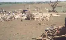 Damage in Bridge Creek was extreme, as many homes were swept away completely, leaving only concrete slabs where the structures once stood. Damage surveyors noted that the remaining structural debris from some of the homes in this area was finely granulated into small fragments, and that trees and shrubs were completely debarked.[22] A few of these homes were bolted to their foundations. Approximately 200 houses and mobile homes were destroyed, and hundreds of other structures were damaged. The Ridgecrest Baptist Church in Bridge Creek was also destroyed in the process. Extensive ground scouring occurred, and vehicles were thrown hundreds of yards from where they originated, including a mangled pickup truck that was found wrapped around a telephone pole. About one inch (25 mm) of asphalt was scoured off one road.