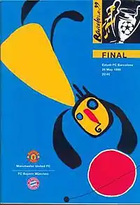 Due to UEFA regulations regarding standing at football matches, the Camp Nou's terraced sections were closed for the 1999 Champions League final, reducing the capacity to approximately 92,000. Of these, around two-thirds were reserved for the two finalist clubs (approximately 30,000 tickets each). The remaining third was divided between fans of FC Barcelona (around 7,500 tickets), UEFA, and competition sponsors.[48] After an initial announcement that the clubs would only receive 25,000 tickets each, the Independent Manchester United Supporters Association (IMUSA) called that figure "ridiculous", claiming it would push black market prices to "astronomical levels"; the group's spokesman, Lee Hodgkiss, suggested a figure closer to 50,000 would be more appropriate, given the stadium's usual capacity of around 115,000.[49] Despite the club receiving only 30,000 tickets, it was estimated that up to 100,000 Manchester United fans travelled to Barcelona for the final, paying around £300 for flights and around £1,000 for match tickets.[50] Many were able to buy tickets from touts, who had paid up to £400 to buy from Barcelona fans who had bought through their club for the equivalent of £28.[51]
