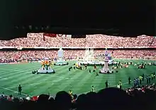 Before kick-off, opera singer Montserrat Caballé – moving around the field on the back of a golf cart[57] – performed a live version of "Barcelona", a song she recorded with the late Queen lead singer Freddie Mercury in 1987, accompanied by a recording of Mercury on the stadium's electronic screen.[58] The opening ceremony featured inflatable versions of some of Barcelona's most recognisable landmarks,[59] as well as flag-bearers waving flags of the crests of the participating teams. Bayern Munich's fans, meanwhile, created a tifo of the name of their team with thousands of coloured cards.[59]