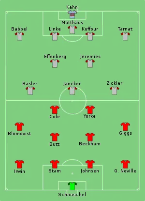 Bayern coach Ottmar Hitzfeld announced his team's line-up for the final two full days ahead of the match.[71] Injuries also impacted on his selections, with French left-back Bixente Lizarazu and Brazilian forward Élber having suffered season-ending knee injuries.[72][73] Élber's absence resulted in Bayern playing a three-man attack of Basler, Jancker and Zickler, while Lizarazu was replaced on the left flank by Michael Tarnat playing in a wing-back role opposite Markus Babbel on the right.[74] Babbel was originally intended to play a man-marking role on Giggs, with his defensive abilities earning him selection ahead of the more attack-minded Thomas Strunz;[71] however, this was nullified by Giggs' selection on the right wing, where he would play against Tarnat. The Bayern defence was anchored around sweeper Matthäus, who played behind Thomas Linke and Ghana international Samuel Kuffour – the only non-German in the Bayern side (by comparison, Manchester United had four Englishmen in their team); Linke and Kuffour's partnership at centre-back meant club captain Thomas Helmer had to settle for a place on the bench.[70] Effenberg and Jens Jeremies played in central midfield for Bayern, with Jeremies man-marking Beckham.[75]