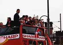 Manchester United planned an open-top bus tour of the city of Manchester the day after the game, at which they would parade their three trophies for an expected 700,000 people lining the streets between Sale and the city centre. The parade culminated with a reception at the Manchester Arena, for which 17,500 tickets were made available at £3 each; proceeds went to Ferguson's testimonial fund.[113] Greater Manchester Police later estimated that the actual number of people who attended the parade was around 500,000.[114]