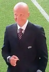 The game's ending was so unexpected that UEFA President Lennart Johansson had left his seat in the stands before Sheringham's equaliser to make his way down to the pitch to present the European Cup trophy, which was already decorated with Bayern ribbons.[89] When emerging from the tunnel at the final whistle, he was stunned, and he later said: "I can't believe it. The winners are crying and the losers are dancing."[90] When the two teams went to collect their medals, Matthäus received his runner-up medal but removed it from his neck almost immediately.[91] He never won the competition as a player, having moved to play in the United States for the MetroStars in March 2000, the year before Bayern next won the European Cup in 2001.[92] Matthäus later commented that "it was not the best team that won but the luckiest".[93] As captain of Manchester United, Schmeichel should have received his medal last, but instead he went up first before having to return to the back of the queue with Ferguson; the pair then lifted the trophy together, surrounded by the rest of Manchester United's players, including May, who climbed the presentation podium to a position of prominence in the celebration photographs.[94]