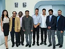Shankar held initial discussions with Kamal Haasan, Aamir Khan, and then Vikram about portraying a further role, though none of the three actors signed on to appear in the film.[59][60] Subsequently, the team held talks with Hollywood actor Arnold Schwarzenegger for the role, who agreed to work on the film for a record remuneration.[61][62][63] The makers then opted against signing Schwarzenegger, though there have been conflicting reasons regarding this decision.[lower-alpha 4] British actress Amy Jackson signed on to work on the film in October 2015 and visited Los Angeles as a part of the team's pre-production work.[66] In late November 2015, Rajinikanth also travelled to Los Angeles to meet the film's producers and complete costume trials and initial motion capture effects work for the film.[67][68] After further negotiations with actors including Hrithik Roshan and Neil Nitin Mukesh, the makers signed on Akshay Kumar to portray the role for which Schwarzenegger was initially considered.[69]