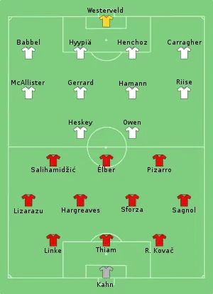Liverpool kicked off the second half, and within 13 seconds they had scored to lead the match 3–0. Liverpool defender Jamie Carragher kicked the ball into the Bayern half, defender Thiam missed his header, which meant the ball dropped to Owen, who controlled the ball with his right foot and then put the ball into the Bayern goal with his left foot.[13] Bayern reduced the deficit in the 57th minute when Salihamidžić scored. He headed the ball into the Liverpool goal from Bayern's first corner of the match to reduce the deficit to two goals.[14] Midway through the half both teams made substitutions. Bayern replaced Sforza, Claudio Pizarro and Salihamidžić for Niko Kovač, Carsten Jancker and Roque Santa Cruz respectively. Liverpool substituted Gerrard and Riise for Igor Bišćan and Danny Murphy respectively.[14] Liverpool started to pass the ball around their midfield and defence in an attempt to waste time, however in the 82nd minute Bayern scored again. Substitute Jancker headed into the Liverpool goal from a cross by Elber.[13] Immediately afterwards Bayern had an opportunity to equalise, however Lizarazu's shot was straight at Liverpool goalkeeper Sander Westerveld. No further goals were scored and the referee blew for full-time with the final score 3–2 to Liverpool.[15]