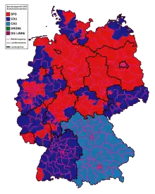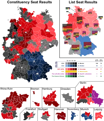 Federal elections were held in Germany on 18 September 2005 to elect the members of the 16th Bundestag. The snap election was called after the government's defeat in the North Rhine-Westphalia state election, which caused them to intentionally lose a motion of confidence to trigger an early federal election. The outgoing government was a coalition of the centre-left Social Democratic Party of Germany (SPD) and Alliance 90/The Greens, led by federal Chancellor Gerhard Schröder. The election was originally intended for the autumn of 2006.[1][2]